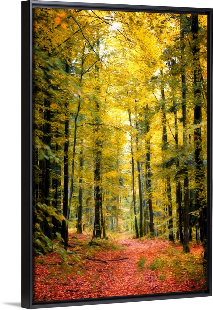 <p>Vertical photograph with a painted feel, of Autumn woods with yellow leaves on the trees and red leaves on the ground.</p>