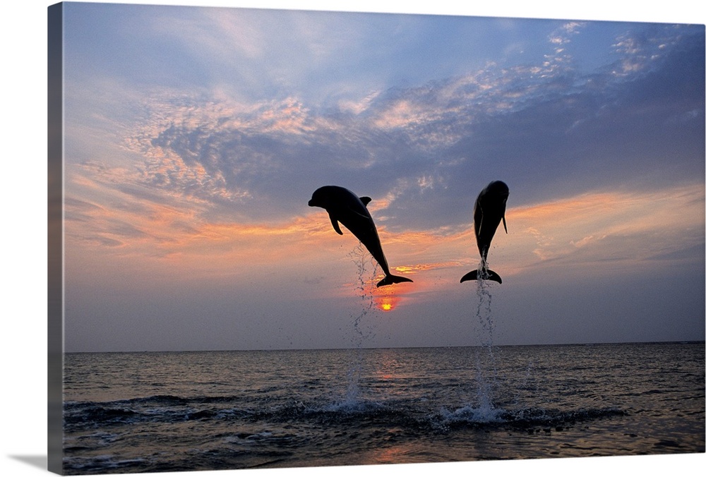 <p>Two dolphins are shown jumping out of the ocean and are silhouetted by the sunset behind them.</p>