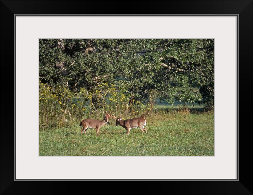 <p>Oversized horizontal photograph of two bucks rubbing their antlers together while standing in a clearing, in front of large trees in the background, in the Great Smoky Mountains National Park in Tennessee.</p>