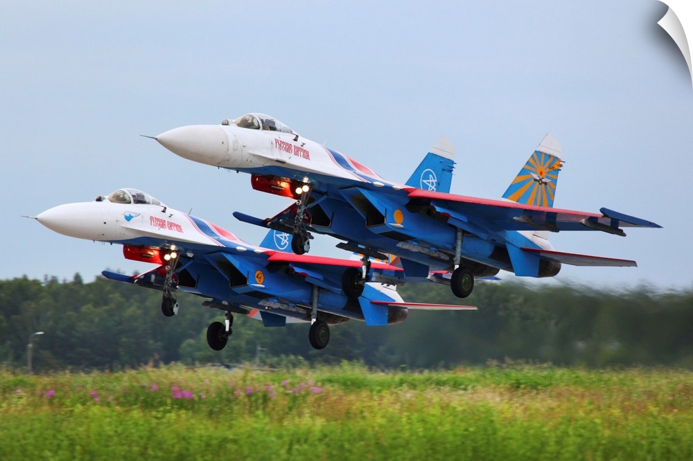 <p>Pair of Su-27 jet fighters of the Russian Knights aerobatics team taking off.</p>