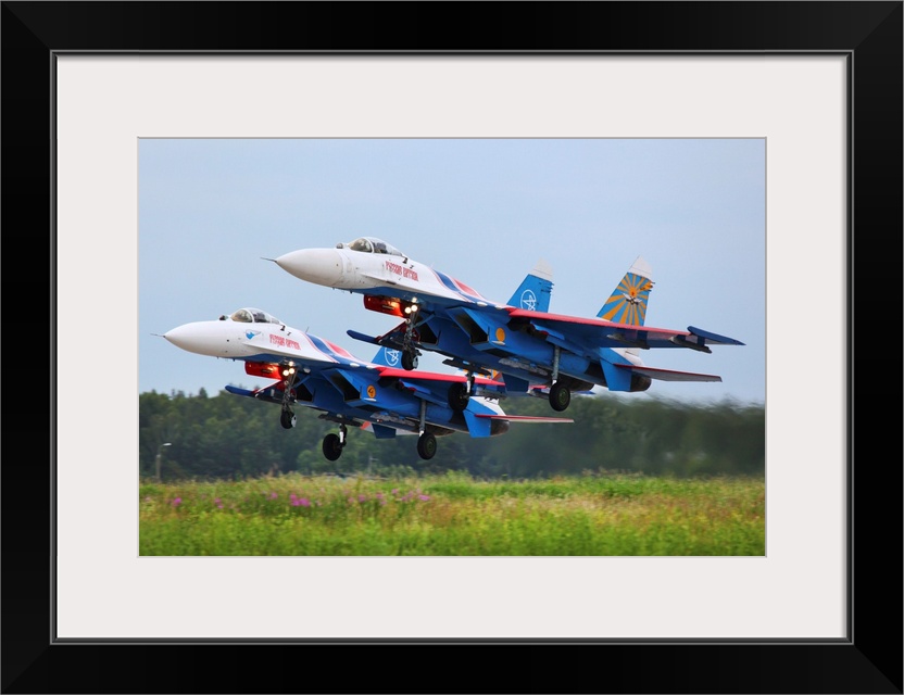 <p>Pair of Su-27 jet fighters of the Russian Knights aerobatics team taking off.</p>
