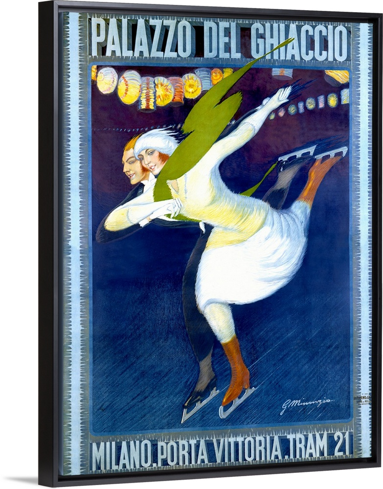 <p>Vertical, vintage advertisement on a large wall hanging, for Palazzo Del Ghiaccio, featuring a man and woman ice skating together in a synchronized form, as decorative lights hang above them.</p>