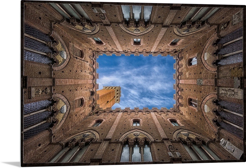 <p>Looking up to the sky from inside the courtyard of an building.</p>