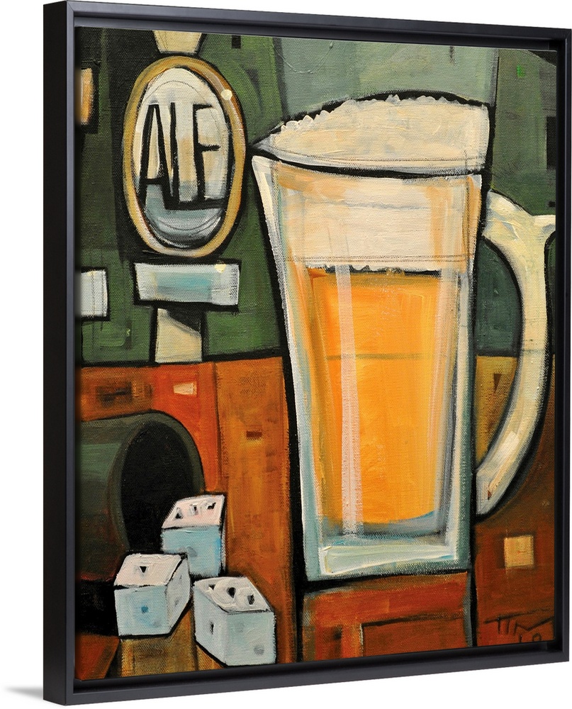 <p>Vertical, contemporary painting on a large wall hanging of a mug of beer sitting on a bar counter, next to several dice. In the background, the word "ale" can be read on a tap, behind the bar.</p>