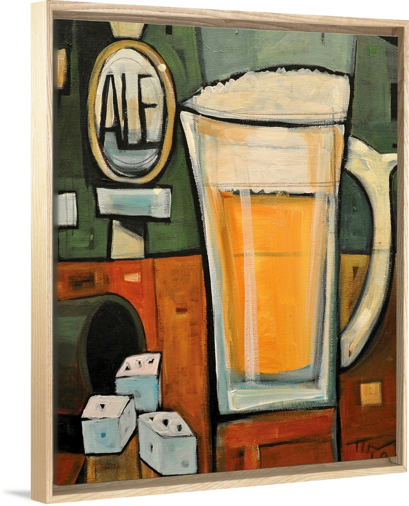<p>Vertical, contemporary painting on a large wall hanging of a mug of beer sitting on a bar counter, next to several dice. In the background, the word "ale" can be read on a tap, behind the bar.</p>