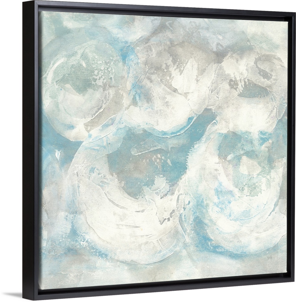 <p>Square abstract painting of textured swirls of white and blue.</p>