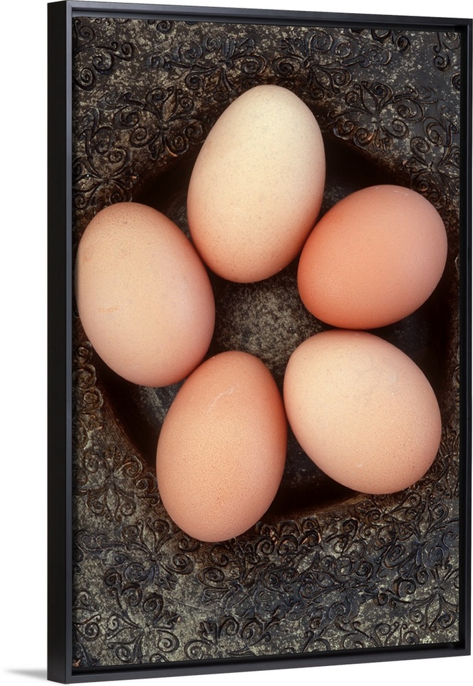 <p>Five pale brown eggs lying in patterned gold and brown dish</p>