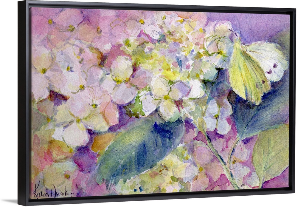 <p>Oversized, landscape, floral watercolor painting of a pale clouded yellow butterfly (colias hyale) that has landed on a fully bloomed hydrangea plant against a pastel background.</p>