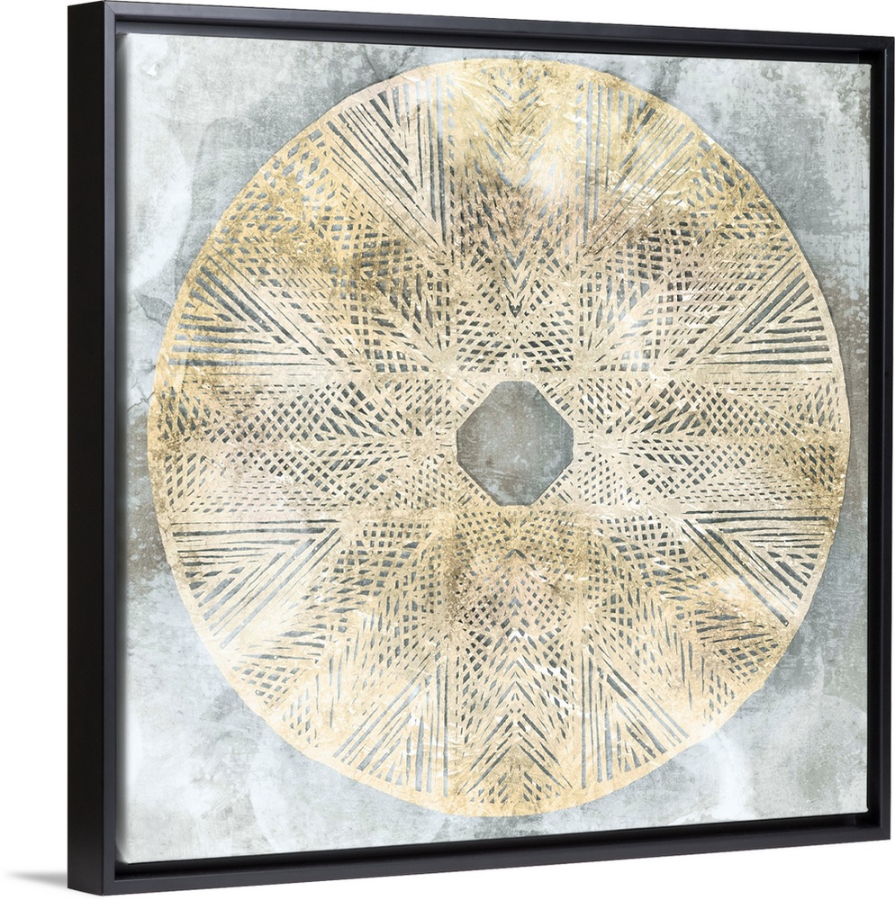 <p>Golden circular mandala-like design on a textured grey background.</p>
