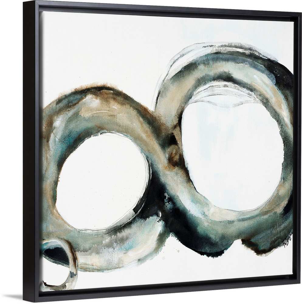 <p>Abstract painting in contrasting neutral tones of a figure eight, lying horizontally on its side, with a tiny circle that partially overlaps the front of it, on a solid neutral background.</p>