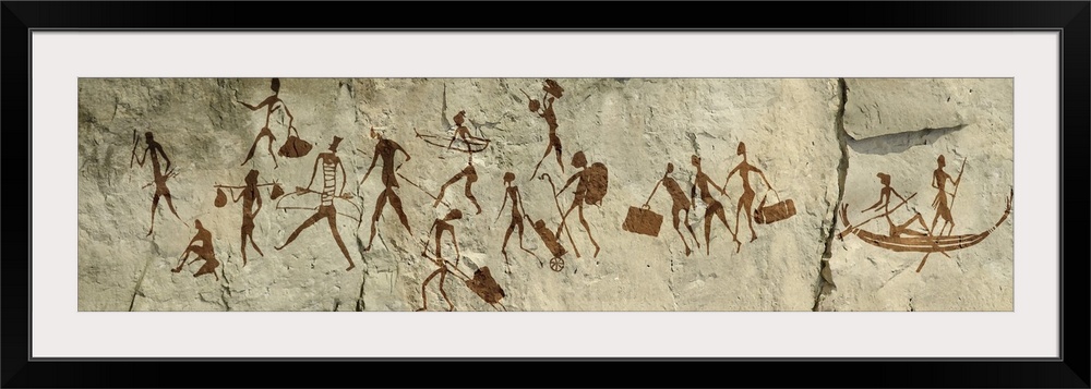 <p>Paleolithic and Neolithic human migrations. Conceptual illustration in the form of a cave painting showing the human migrations of the Paleolithic and Neolithic, two periods of the Stone Age. The Palaeolithic lasted from around 2.6 million years ago up to around 10,000 years ago. The Neolithic lasted from around 10,000 years ago to around 4500-2000 BC.</p>