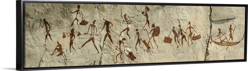 <p>Paleolithic and Neolithic human migrations. Conceptual illustration in the form of a cave painting showing the human migrations of the Paleolithic and Neolithic, two periods of the Stone Age. The Palaeolithic lasted from around 2.6 million years ago up to around 10,000 years ago. The Neolithic lasted from around 10,000 years ago to around 4500-2000 BC.</p>