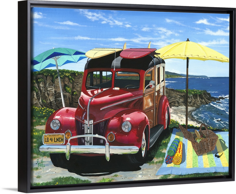 His clearly recognizable images of Hawaii beaches and flowers go alongside iconic surfing art featuring woodie cars, flip flops, surfboards and whimsical dogs.