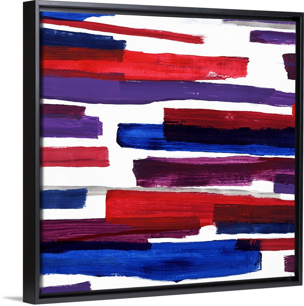 <p>Contemporary abstract painting with horizontal bars made of red, purple, blue, and gray hues coming from both the left and right sides.</p>
