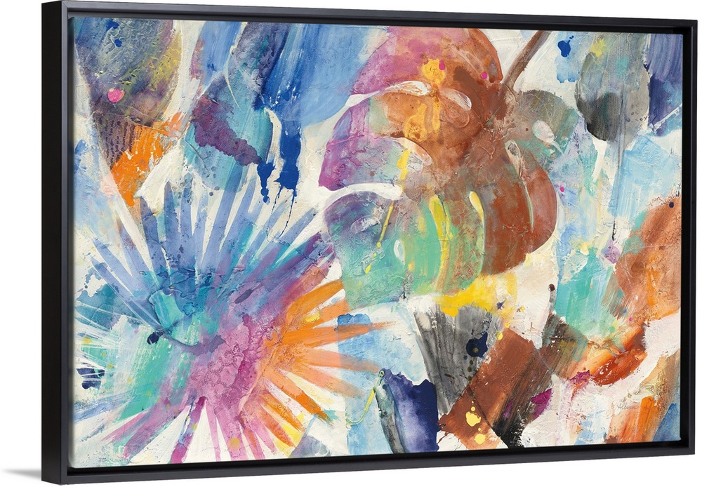 <p>Colorful abstract painting with tropical palm leaves.</p>