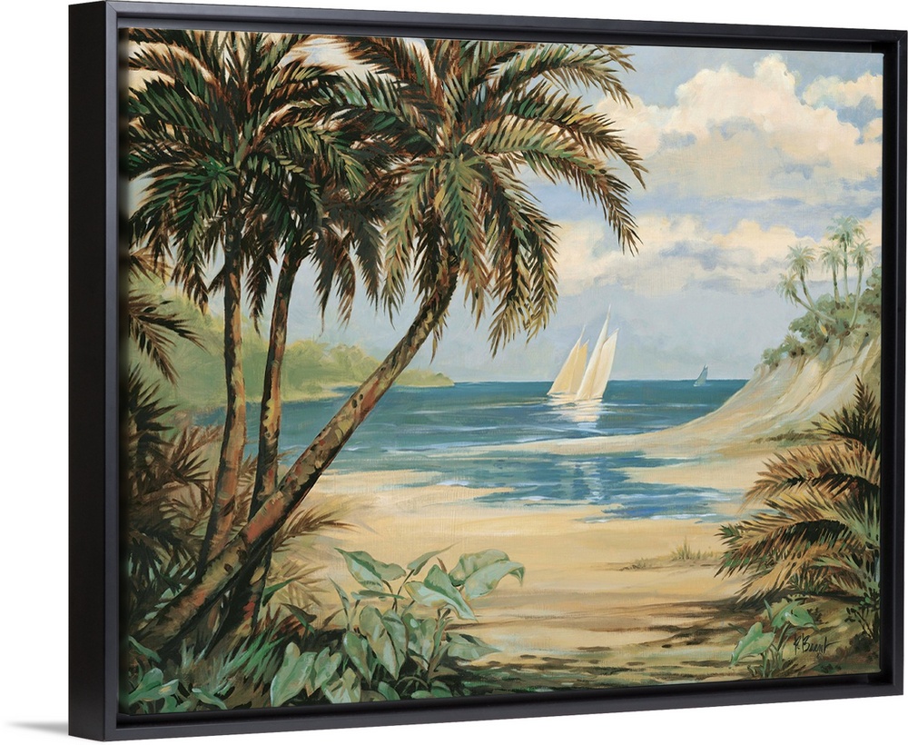 <p>Contemporary painting of palm trees overlooking the beach with a sailboat.</p>