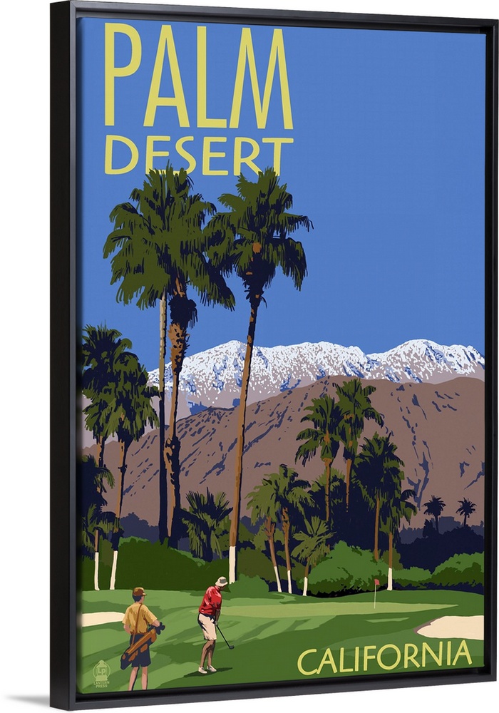 <p>Retro stylized art poster of golfers on a golf course with tall palms and a mountainous background.</p>
