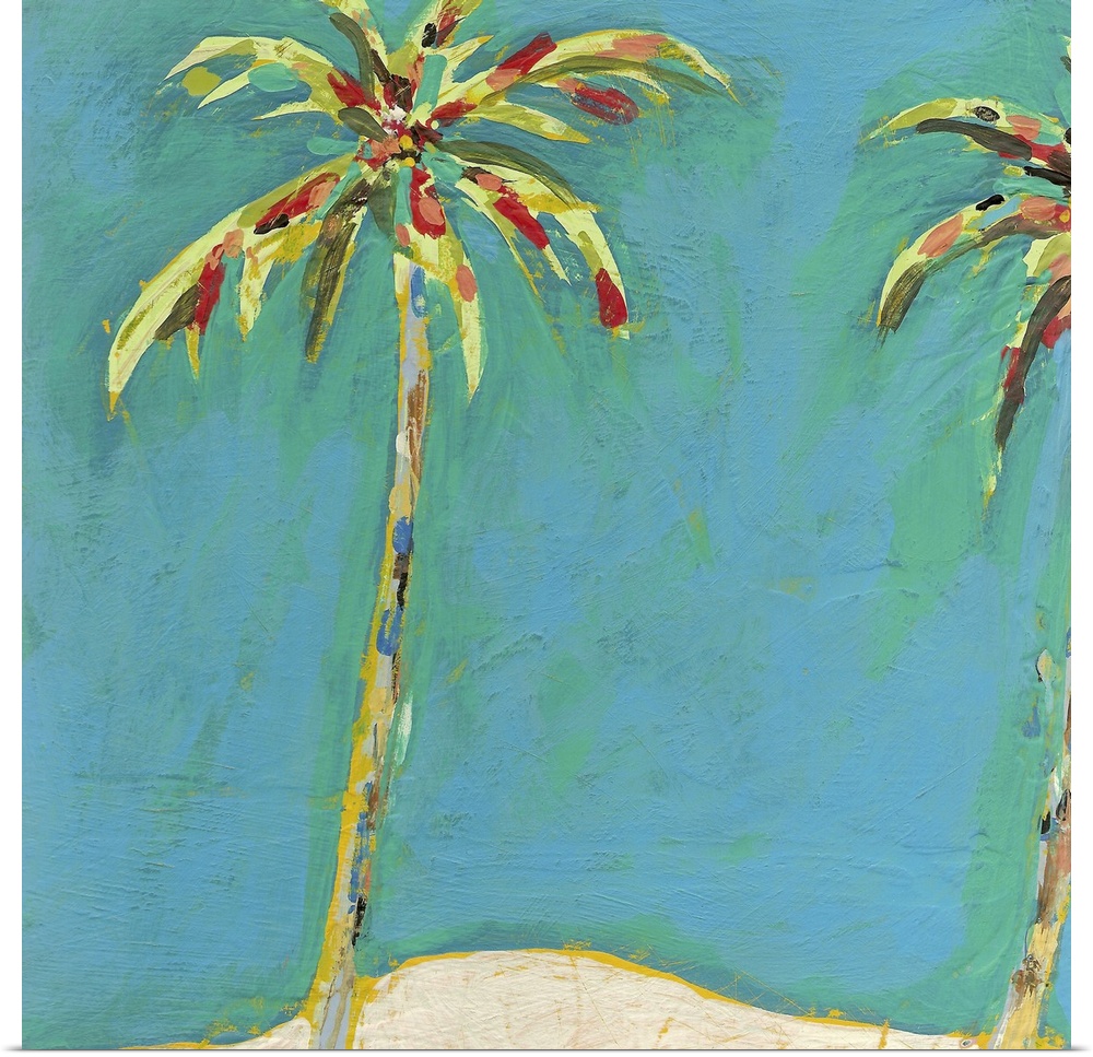 <p>Contemporary artwork of palm trees that have many different colors used to paint them.</p>