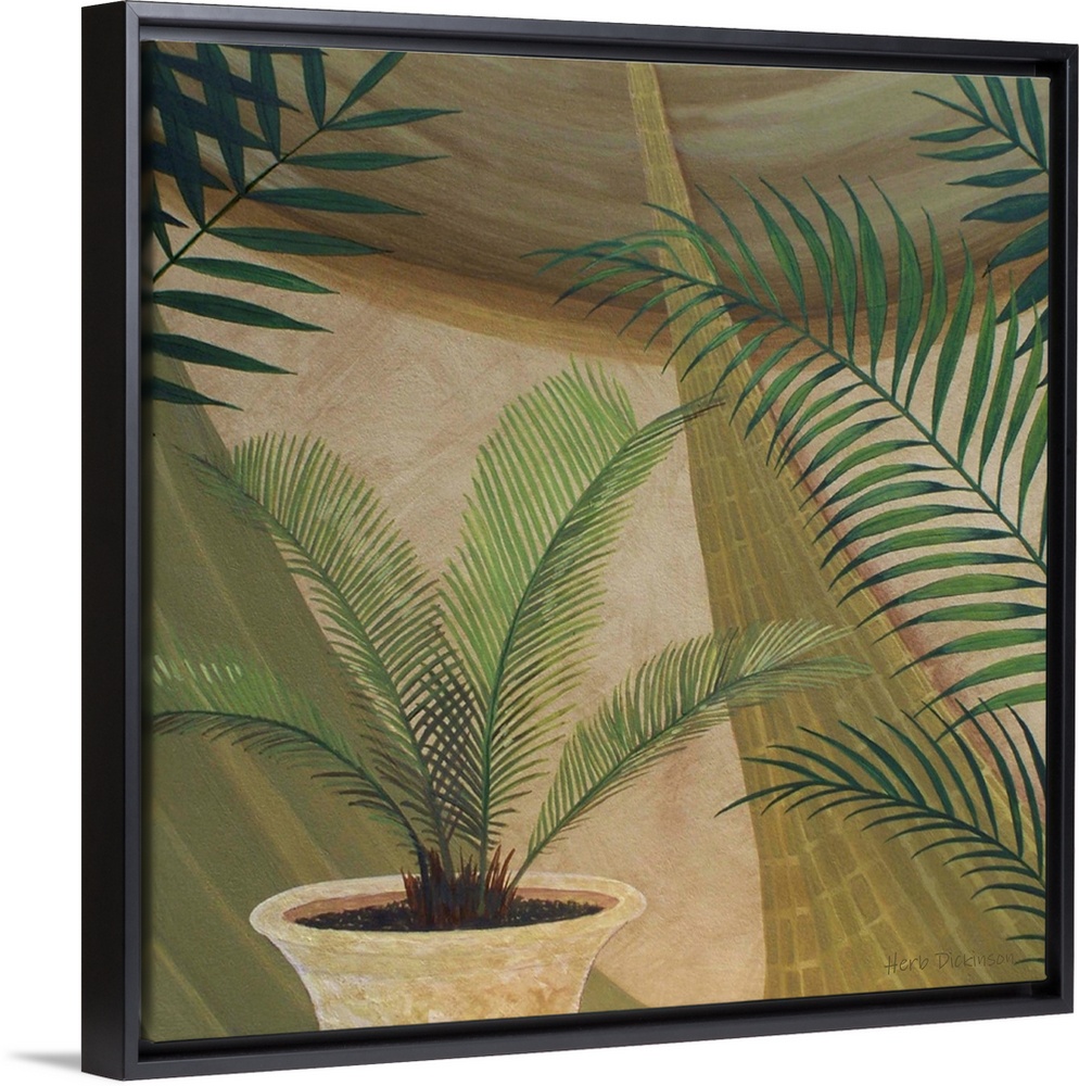 <p>Square still life painting of a potted palm plant surrounded by palm branches in earth tones.</p>