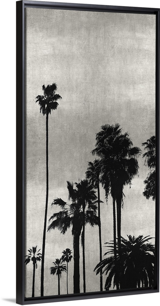 <p>Decorative artwork featuring a black silhouette of a palm tree over a distressed background.</p>