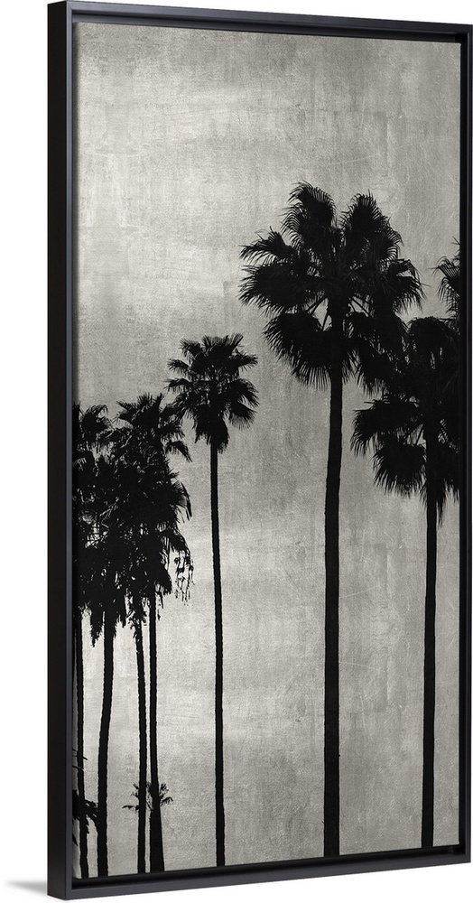 <p>Decorative artwork featuring a black silhouette of a palm tree over a distressed background.</p>
