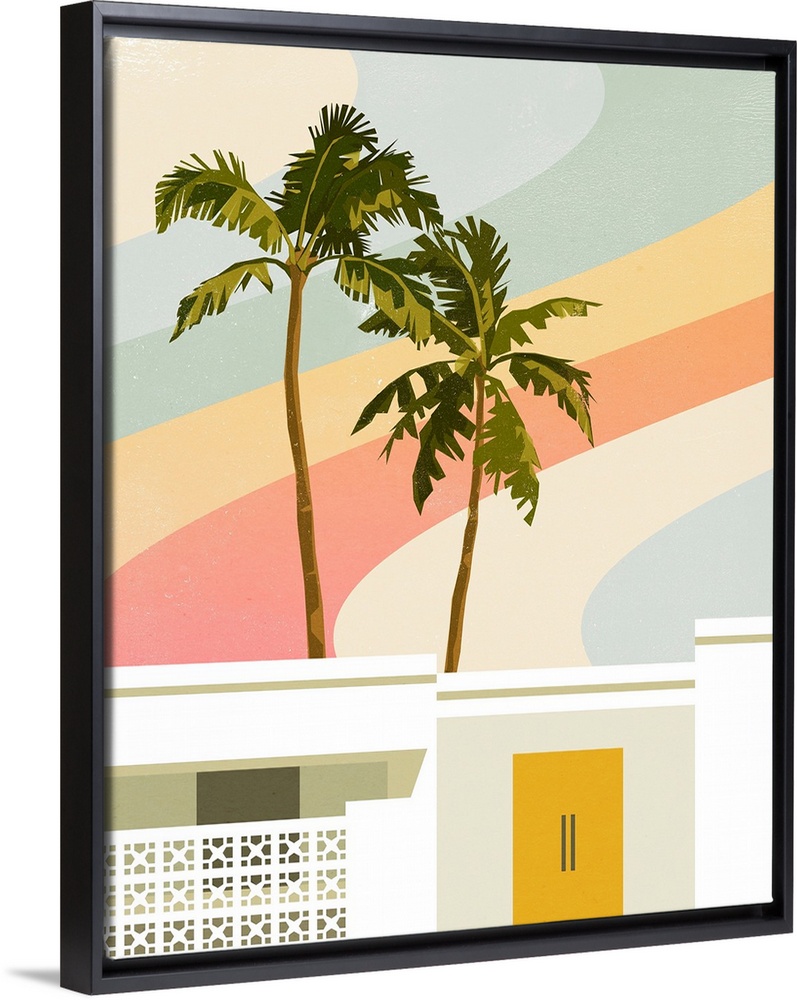 <p>A contemporary mid-century modern graphic illustration of a white stucco home with classic palm springs architectural details and two tall palm trees in front of a swirly pastel sky</p>