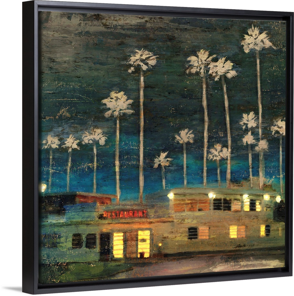 <p>Artwork of tall palm trees over small shops at night.</p>