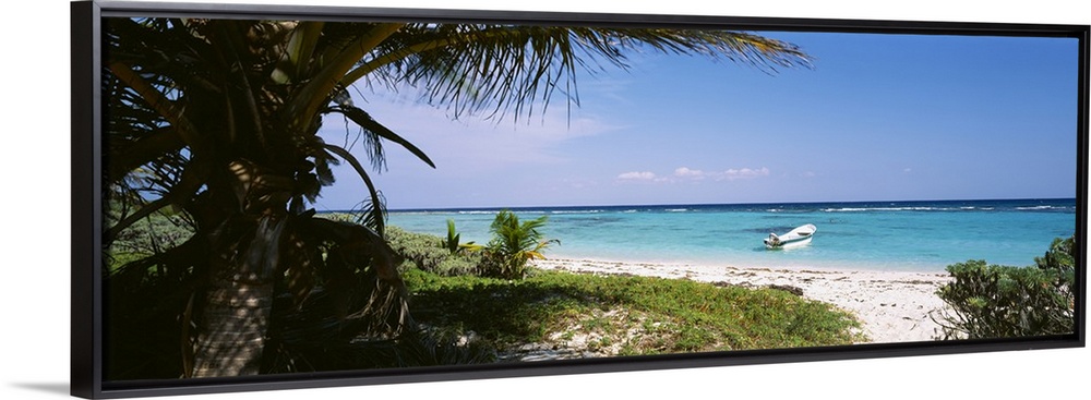<p>Panoramic view looking past a short, fat palm tree out to the aqua blue waters of the caribbean ocean where an abandonded boat is moored close to the sandy shore.</p>