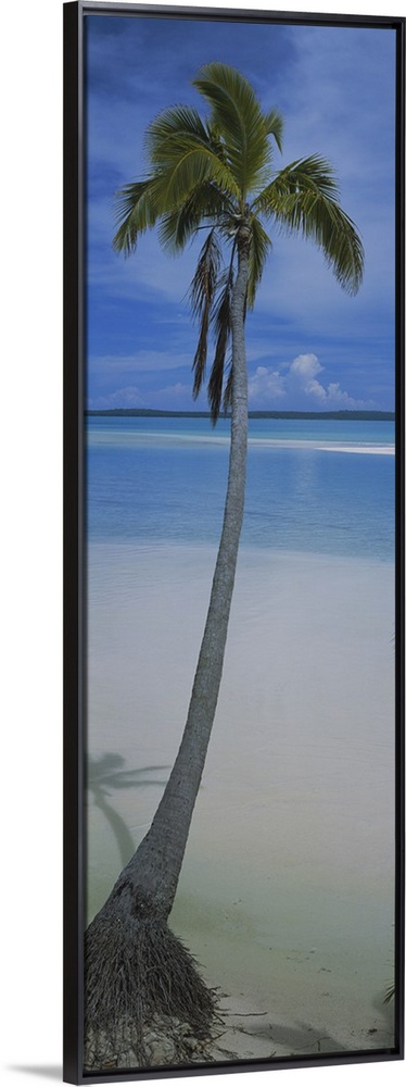 <p>A single palm tree is photographed in vertical panoramic view with sand and ocean water just in front of it.</p>
