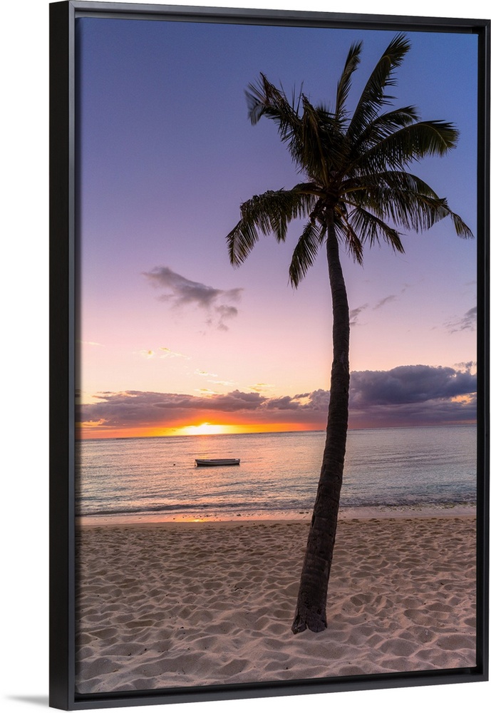 <p>Palm tree on tropical beach during sunset, Le Morne Brabant, Black River district, Mauritius, Indian Ocean, Africa</p>