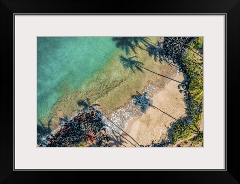 <p>Aerial view of palm tree shadows on the sand of a tropical beach at the water's edge. Kihei, Maui, Hawaii, united states of America.</p>