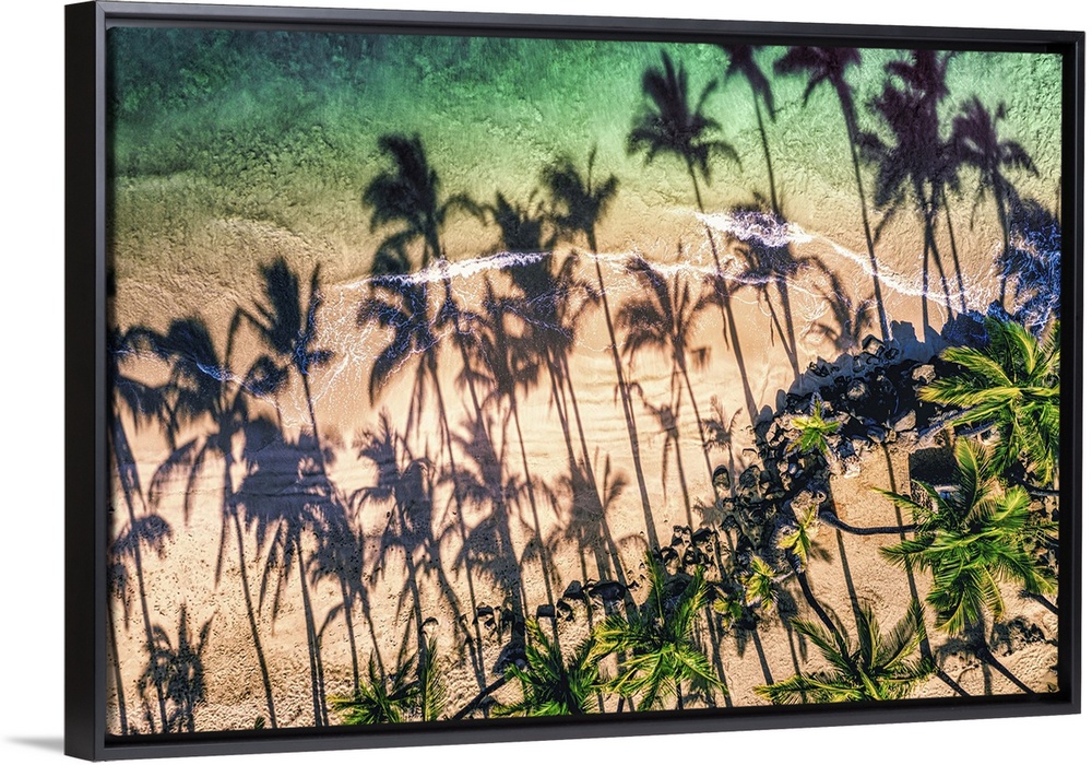 <p>Aerial view of palm tree shadows on the sand of a tropical beach at the water's edge, Kihei, Maui, Hawaii, united states of America.</p>