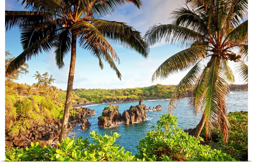 <p>Landscape photograph of two large palm trees swaying over the coastline in Maui, Hawaii. Large rocks in the blue waters at Wainapanapa State Park.</p>