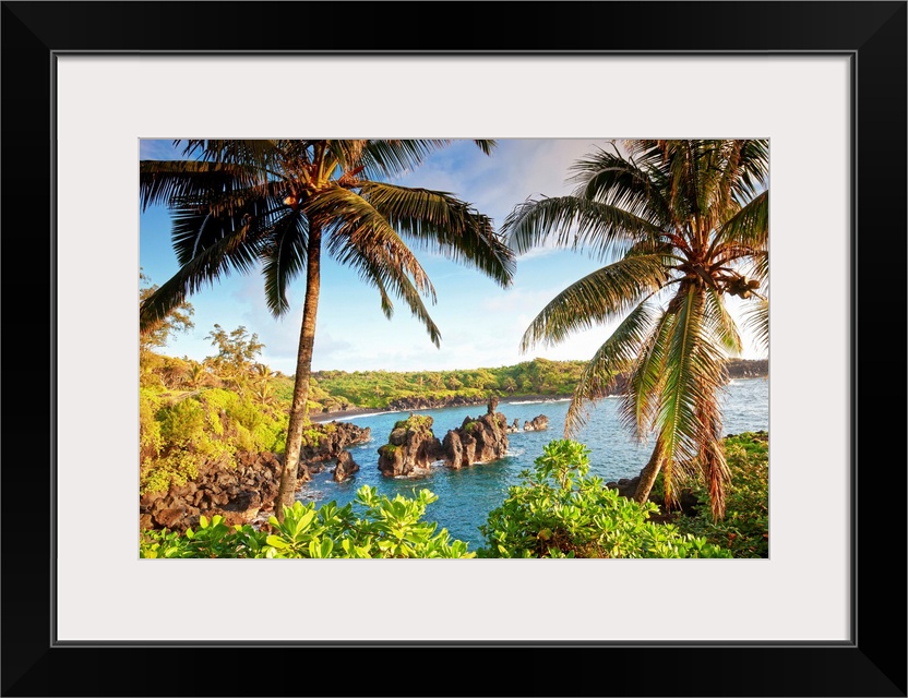 <p>Landscape photograph of two large palm trees swaying over the coastline in Maui, Hawaii. Large rocks in the blue waters at Wainapanapa State Park.</p>