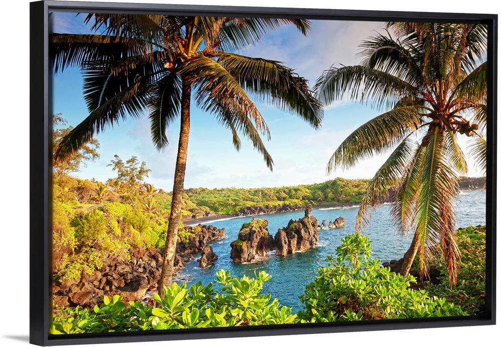 <p>Landscape photograph of two large palm trees swaying over the coastline in Maui, Hawaii. Large rocks in the blue waters at Wainapanapa State Park.</p>