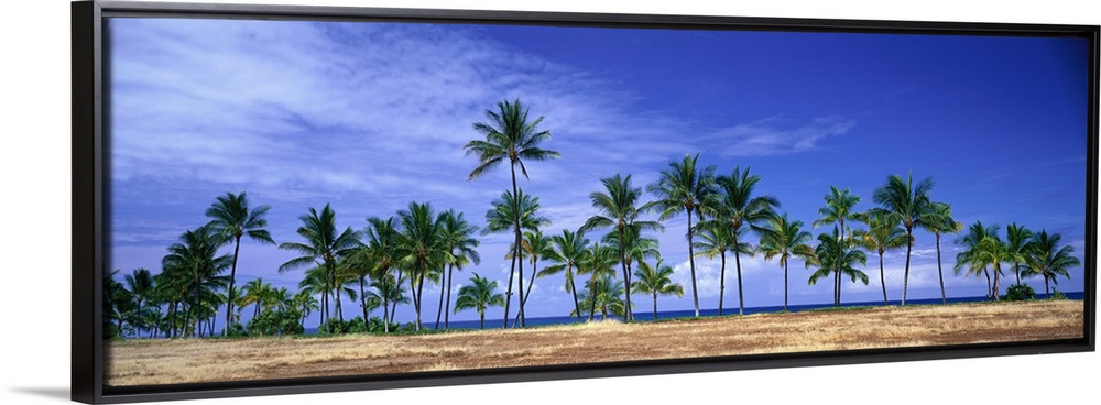 <p>Panoramic of a row of palm trees lined up along the shore of Hawaii.</p>