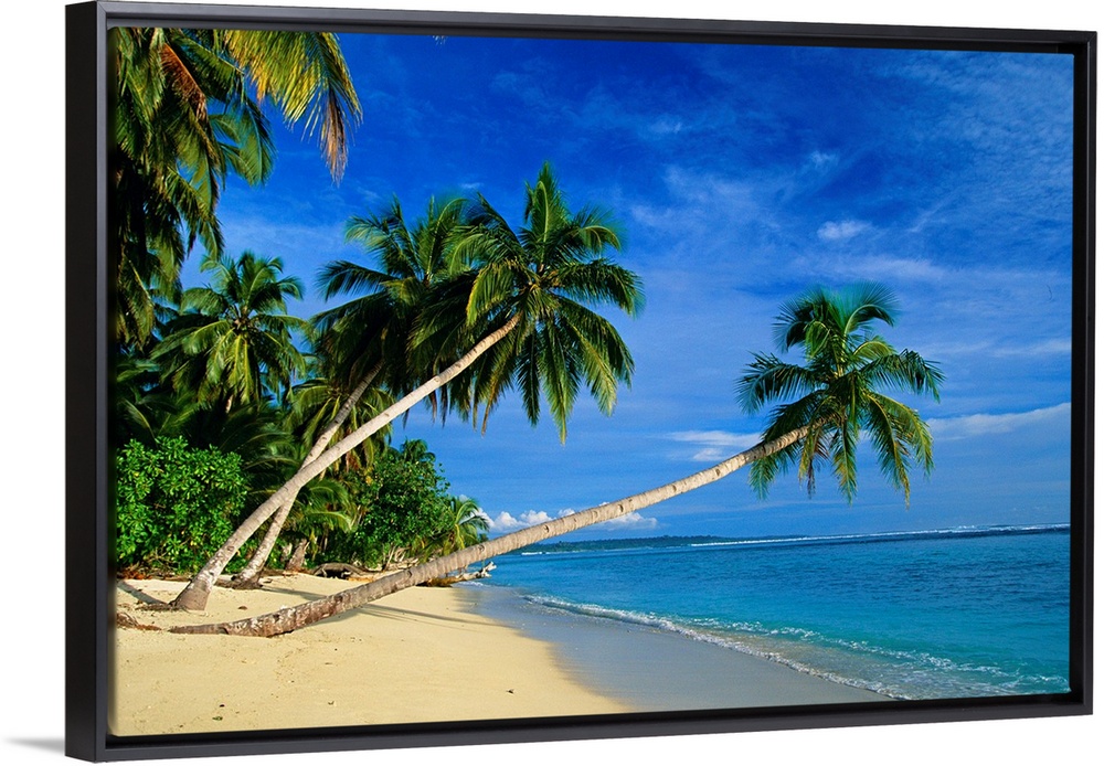<p>A beautiful photograph of palm trees leaning over the beach with the ocean water breaking onto the coast.</p>