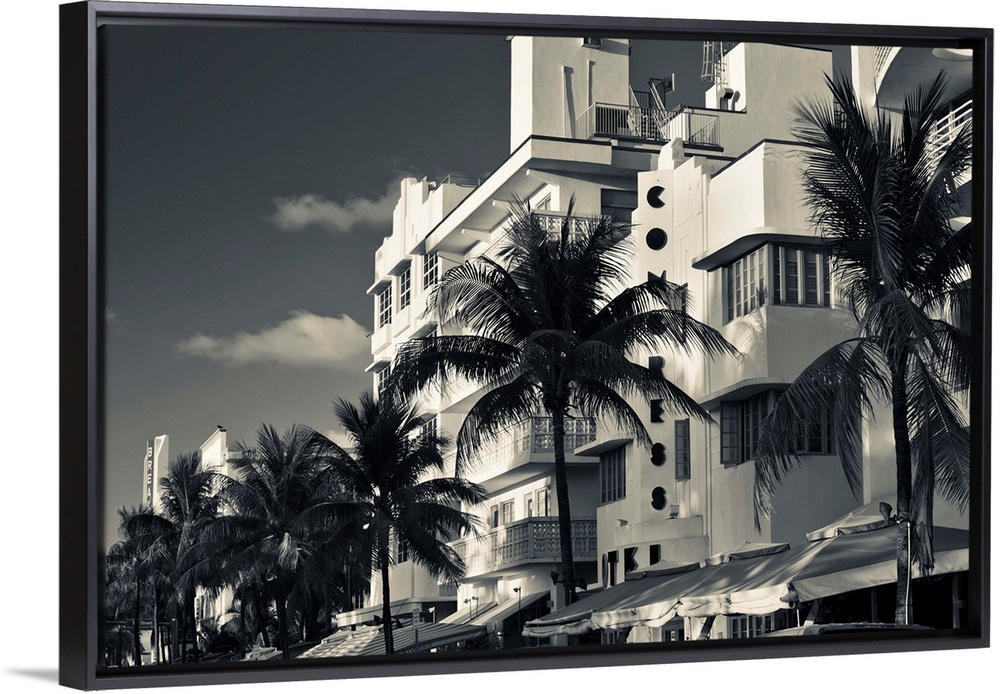 <p>Palm trees in front of art deco hotels, ocean drive, south beach, miami beach, miami-dade county, florida, USA.</p>