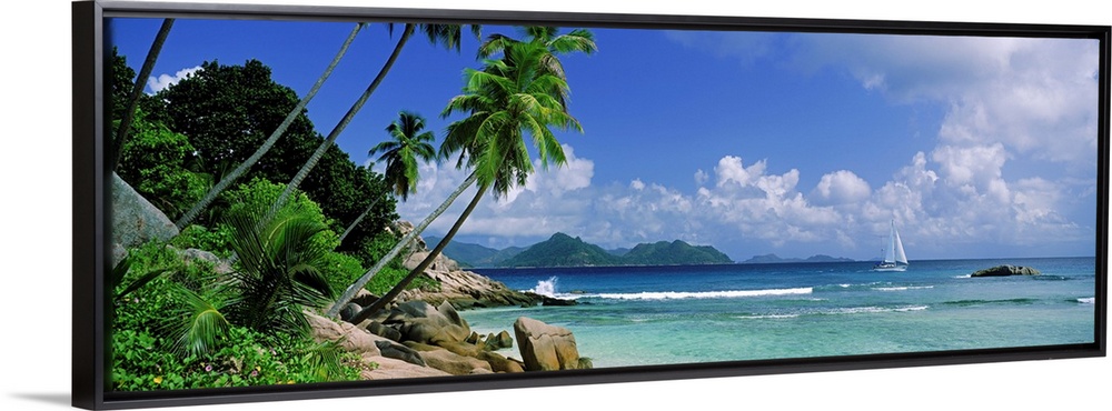 <p>Long panoramic image of palm trees lining a beach with a sailboat sailing in the ocean.</p>