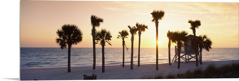 <p>A large panoramic piece of palm trees on the beach with a lifeguard house in front of them. The ocean and a setting sun can be seen in the distance.</p>