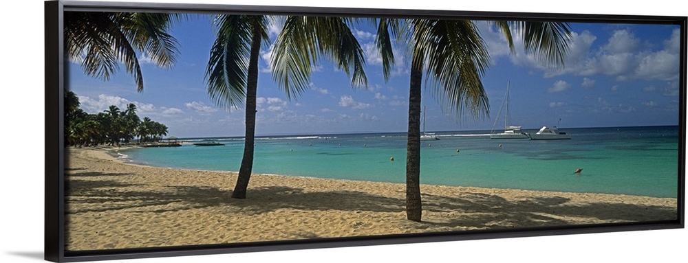 <p>Big, panoramic photograph of palm trees swaying over Sainte Anne Beach, crystal blue waters in the background in Sainte Anne, Grande Terre, Guadeloupe.</p>