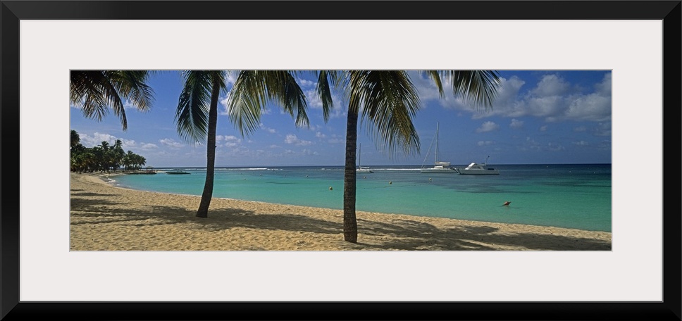 <p>Big, panoramic photograph of palm trees swaying over Sainte Anne Beach, crystal blue waters in the background in Sainte Anne, Grande Terre, Guadeloupe.</p>