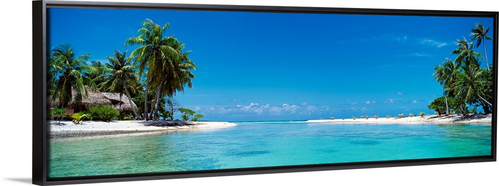 <p>A panoramic photograph of a tropical lagoon surrounded by trees and huts.</p>