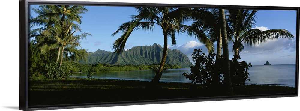 <p>Widen angle photograph on a giant wall hanging of palm trees swaying on the coastline of Kaneohe Bay, mountains on the distant horizon, in Oahu, Hawaii.</p>