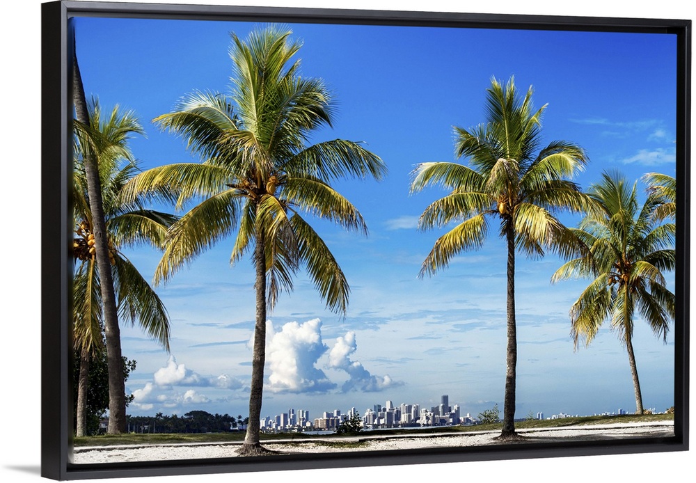 <p>Several palm trees on the coast with the city of Miami in the distance.</p>