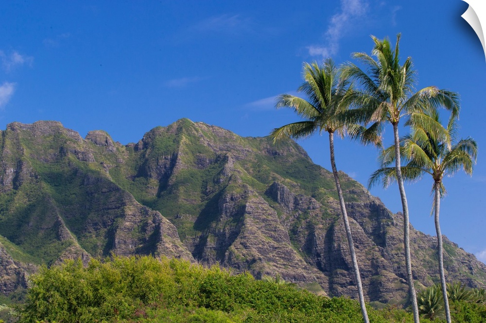 <p>Palm trees with mountain range in the background, Tahiti, French Polynesia</p>