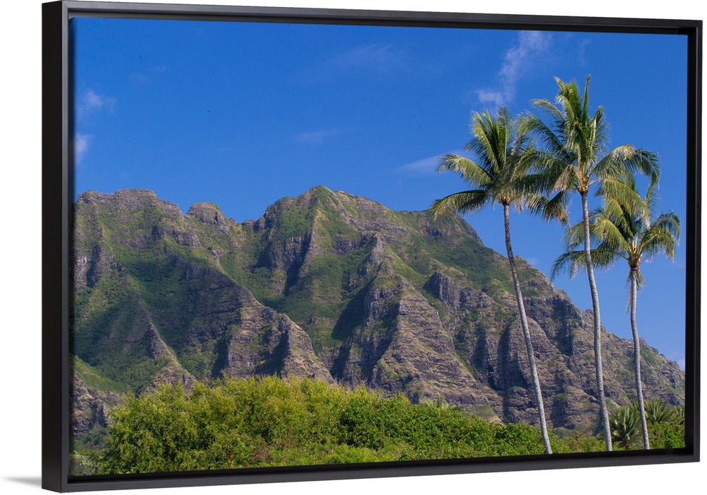 <p>Palm trees with mountain range in the background, Tahiti, French Polynesia</p>