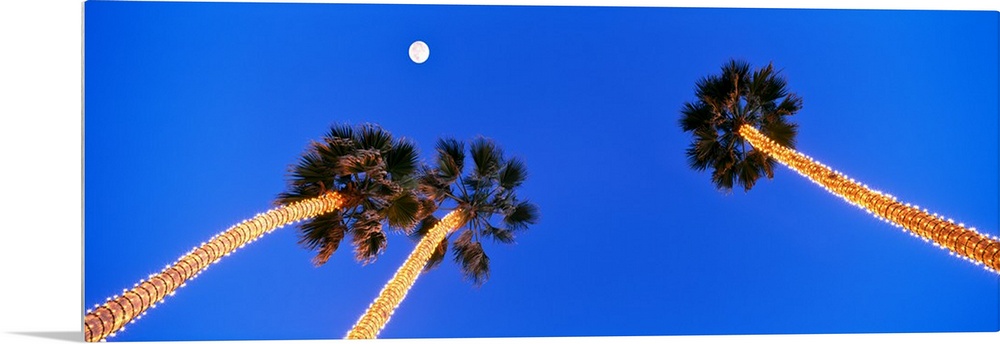 <p>Palm trees wrapped with white lights look upward towards a full moon, Pacific Beach, San Diego, San Diego County, California, USA.</p>
