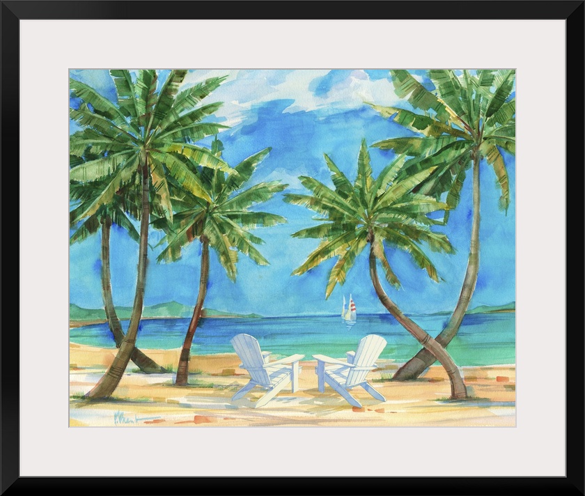 <p>Watercolor painting of palm trees growing on the beach with white beach chairs.</p>