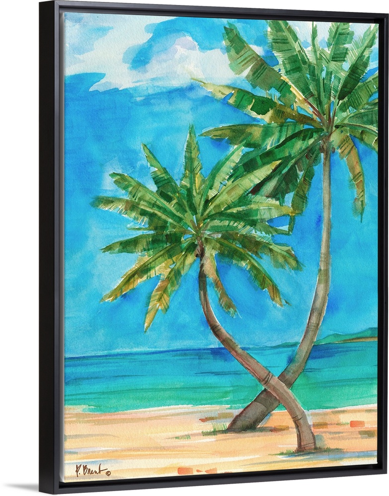 <p>Watercolor painting of palm trees growing on the beach near a turquoise ocean.</p>
